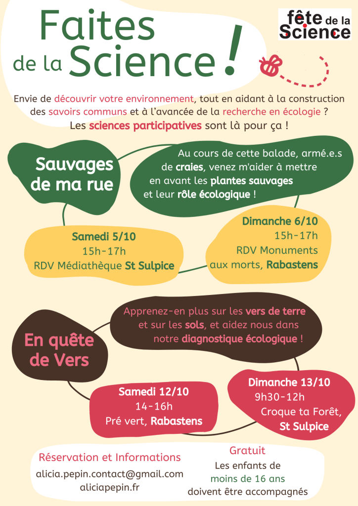 Pour l’occasion je vous propose de découvrir les sciences participatives en écologie. C’est l’occasion de découvrir votre environnement, d’en apprendre plus sur le fonctionnement des écosystèmes autour de vous, et d’aider les scientifiques à faire avancer la recherche !